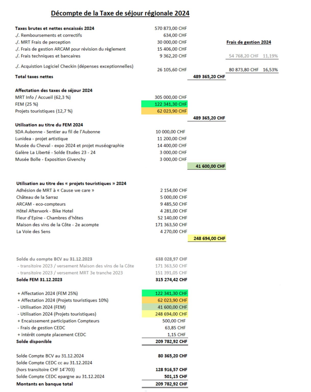 L’ARCAM joue le rôle d’accompagnateur et de facilitateur pour l’émergence de nouvelles offres et prestations touristiques. A ce titre, elle est intervenue pour soutenir la mise en œuvre de nombreux projets, comme l’attestent les soutiens financiers au travers du Fonds d’équipement touristiques de la région morgienne (FEM). Voir décompte de la Taxe de séjour ci-après.